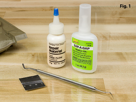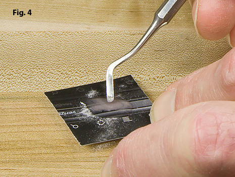 The cyanoacrylate that you need is Zap-A-Gap, Fig. 1. I like to mix the cyanoacrylate and powder together on a thick, slick piece of paper. I usually cut up a thick magazine cover or old calendar. Don’t use porous paper because the cyanoacrylate will just go right through. Squeeze out an amount of cyanoacrylate on the paper first, Fig. 2. You then add the acrylic powder, Fig. 3. It works best if you add a little and stir the mixture quickly to incorporate the powder into the cement, Fig. 4. You can then add more powder to make it as thick as you want. The thicker you make it the faster it sets. Make up a few tests and see how it mixes and handles. I’d be willing to bet that once you get the hang of this, you will find a number of uses for it.