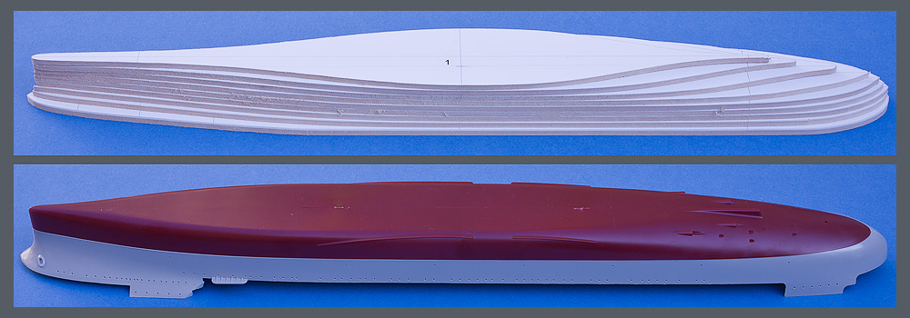 Here is the comparision between the scratch built hull and the Trumpeter hull. I think the differences are striking and worth the effort.