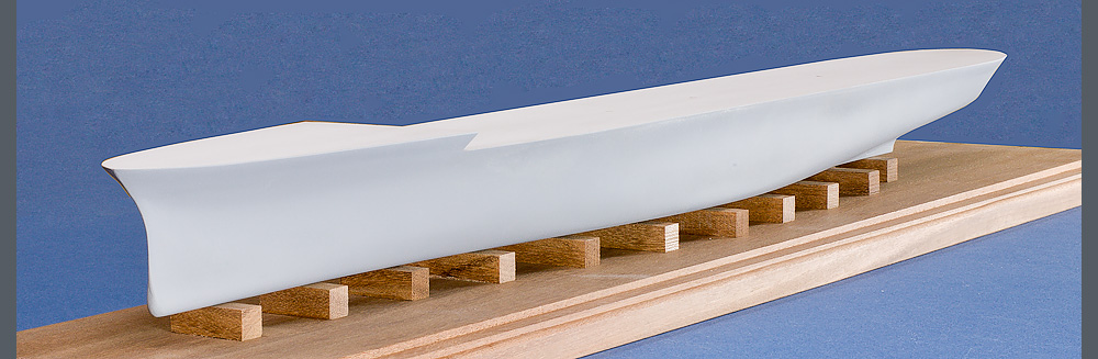 This is the first coat of primer to check for necessary refinements. Hull has been mounted on a mahogany base.